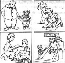 This is the picture for your reference. It shows a small boy' s childhood: 1. taken out by his grandpa for a walk, 2. taught to write by his parents, 3. looked after by a nanny, 4. playing with other children in a kindergarten.
