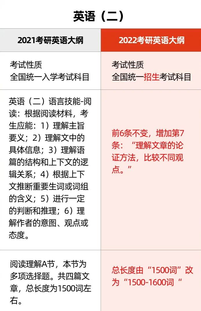 📌英语二:变化主要在阅读理解,阅读技能由原来的6条增加为7条,新增加的第7条为【理解文章的论证方法,比较不同观点】,传统阅读四篇文章总长度由原来1500 词左右变为【1500~1600词】。